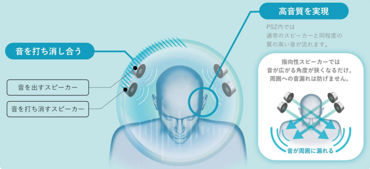 PSZは、音を届けたい範囲にのみ音場を形成しつつ、周囲への音漏れを抑えるNTTの特許技術。正相の音波に対して180度反転した逆位相の波形を重ねることで音を打ち消す原理を応用し、「音を出す」と「音を消す」を同時に行うことで、オープンな環境でも限定的な音空間を実現する。イヤホンやヘッドホンに頼らず、必要な音だけを高音質で楽しめる点が特徴だ。