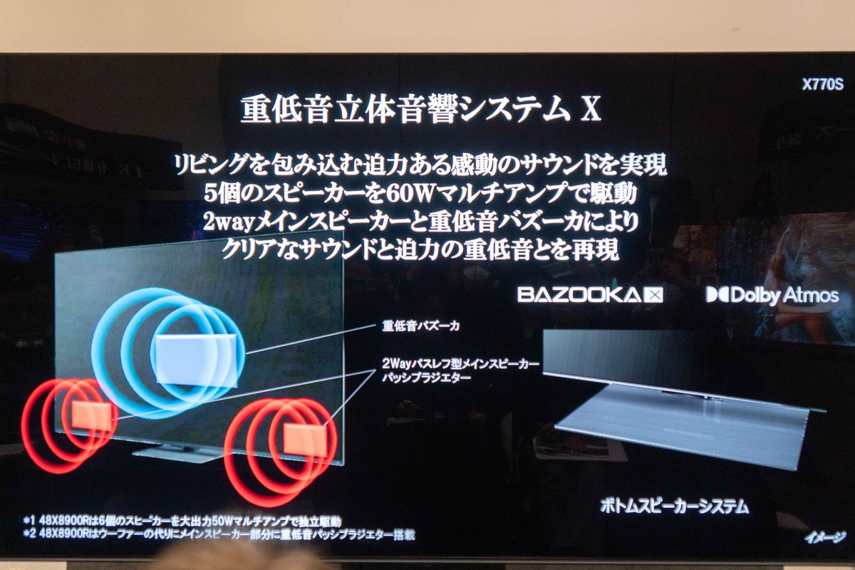 48型「48X770S」のみ、6個のスピーカーを最大出力50Wのマルチアンプで駆動する仕様にしており、ウーファーの代わりに、メインスピーカー部分に重低音パッシブラジエーターを搭載している。立体音響のDolby Atmosには、全インチサイズでカバー。