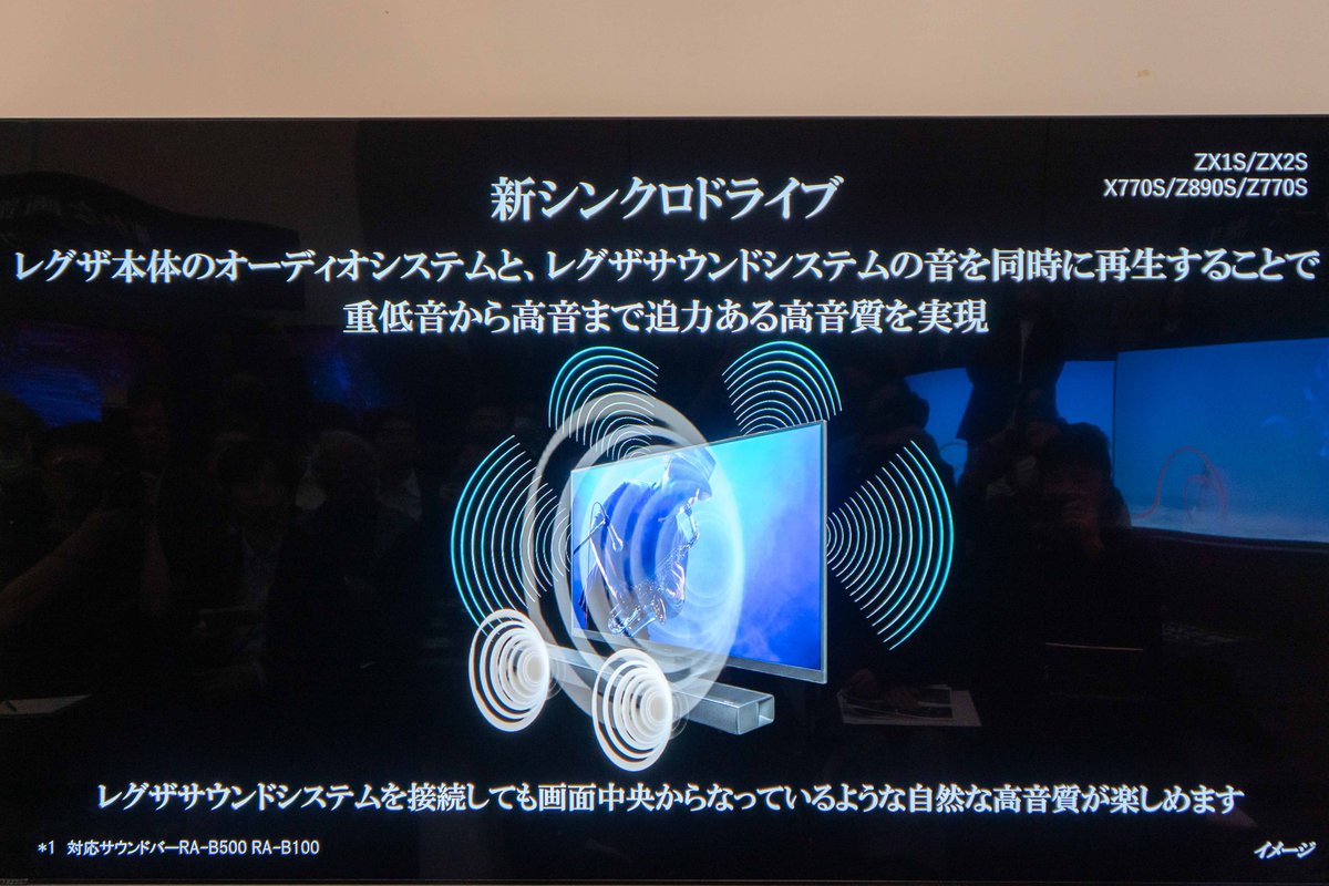 同社のサウンドバー「RA-B500」「RA-B100」と連動したサウンド機能「新シンクロドライブ」も採用。レグザ本体のオーディオシステムと、レグザサウンドシステムの音を同時に再生することで、重低音から高音まで迫力のサウンドを実現している。