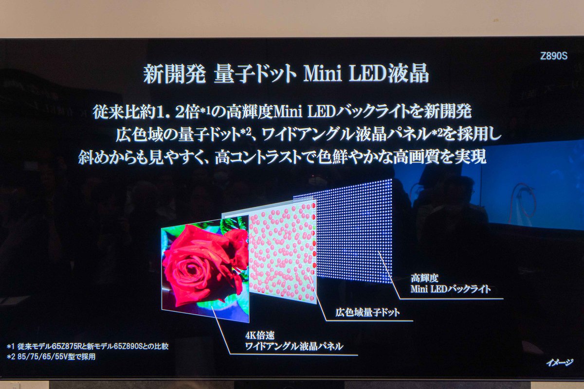 Z890Sシリーズは、「量子ドットMini LED液晶パネル」を採用しており、新開発の高輝度Mini LEDバックライトを搭載。従来モデル「65Z875R」と新モデル「65Z890S」を比較すると、約1.2倍の高輝度化を実現している。