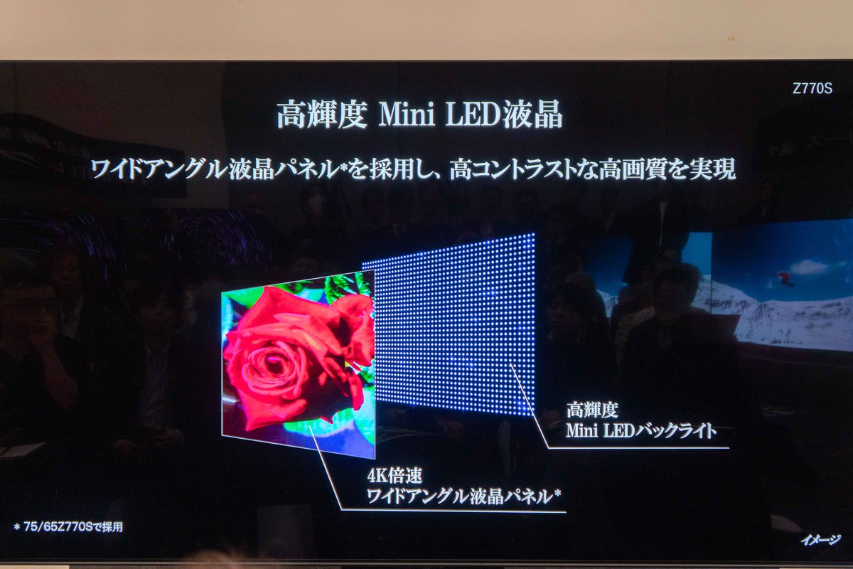 Z770Sシリーズは、「高輝度Mini LED液晶パネル」を搭載したスタンダードクラスであり、加えて「4K倍速ワイドアングル液晶パネル」が投入されている。55/50/43型は、「4K倍速ワイドアングル液晶パネル」が非搭載。量子ドット技術は、Z770Sシリーズ全体で導入されていない。