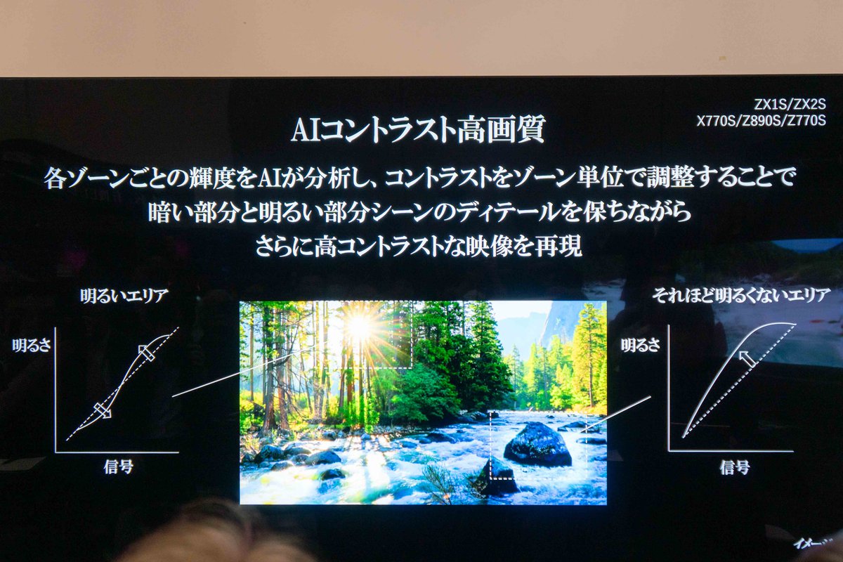 新たに加わった「AIコントラスト高画質」では、映像の各ゾーンの輝度をAIで分析、コントラストをゾーン単位で調整できる。そのため、明るいゾーンでは輝度を上げて光の煌めきを表現し、それほど明るくないゾーンでは中間ガンマを上げることで、暗部が潰すことなくしっかりとディティールを確保すること可能になるため、さらなる高コントラストな映像を再現できるとしている。