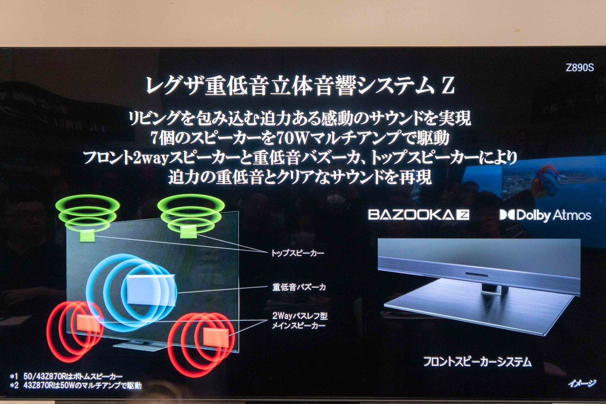 Z890Sシリーズの高音質技術には、「レグザ重低音立体音響システムZ」を採用。2ウェイ・バスレフ型メインスピーカー/トップスピーカー/重低音バズーカの構成による7個のスピーカーを、最大出力70Wのマルチアンプで駆動する仕組みにすることで、迫力のある重低音とクリアなサウンド、そして包み込むような音場表現を確立しているという。