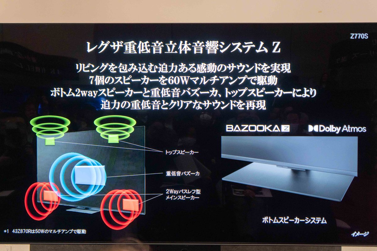 Z770Sシリーズの高音質技術にも、「レグザ重低音立体音響システムZ」を搭載。2ウェイ・バスレフ型メインスピーカー/トップスピーカー/重低音バズーカの構成による7個のスピーカーを、最大出力60Wのマルチアンプで駆動している。43型は最大出力50Wのマルチアンプとしている。Dolby Atmosの再生は、Z890Sシリーズ、Z770Sシリーズの両方ともカバーする。