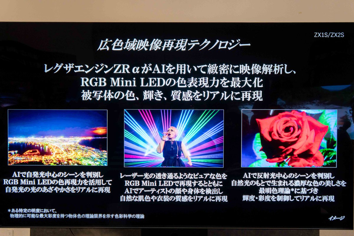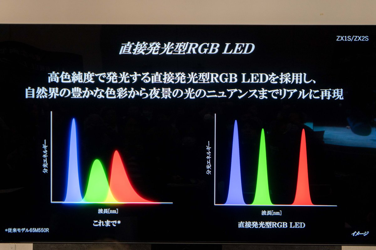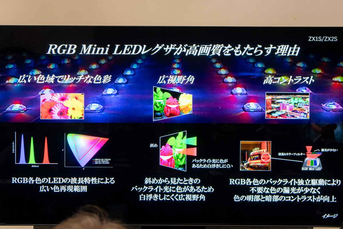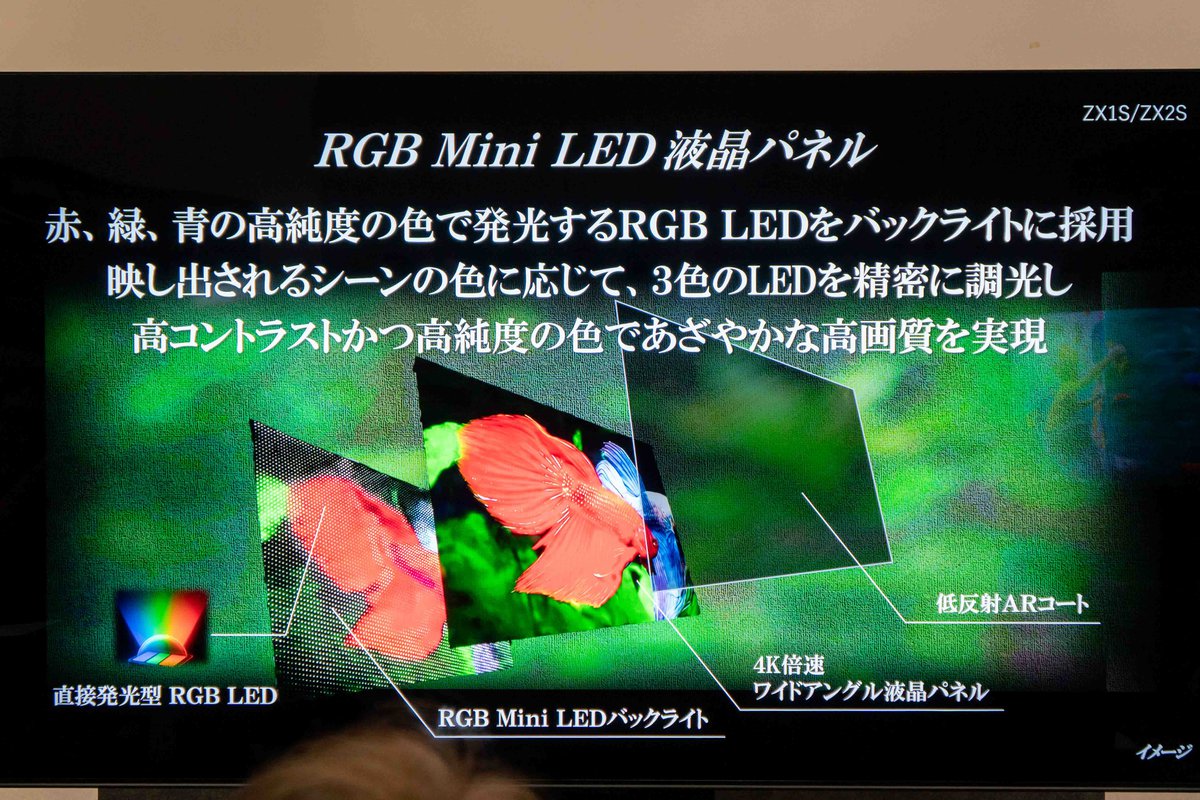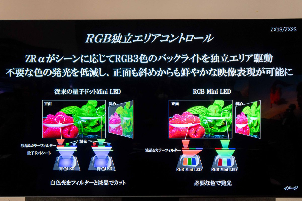 ZX1/ZX2シリーズには、共通して2026年度版の「RGB Mini LED液晶パネル」が導入されており、バックライトにR(赤)/G(緑)/B(青)を独立駆動で発光させる「直接発光型 RGB LED」を使用した、「RGB Mini LEDバックライト」を搭載。加えて、「4K倍速ワイドアングル液晶パネル」、表面に「低反射ARコート」組み合わせた液晶パネルとなっている。