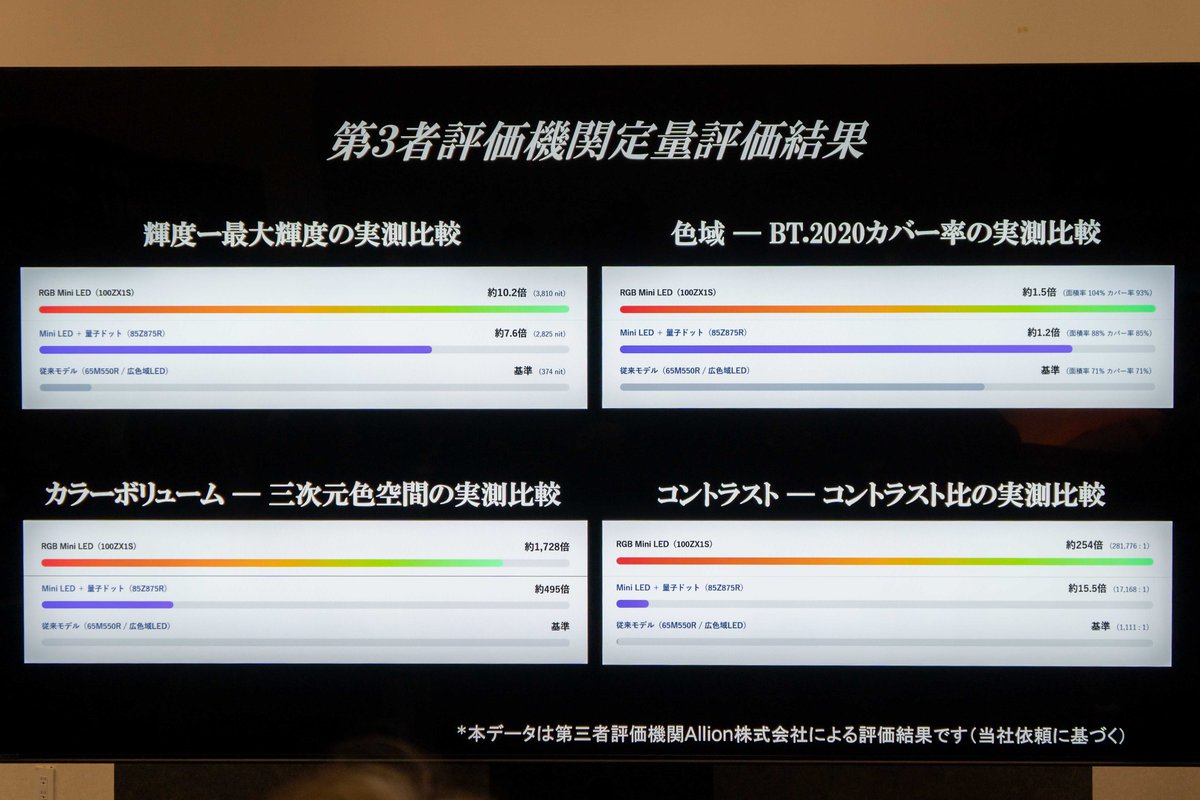 第三者評価機関による定量評価結果も公開。量子ドット技術を搭載した4K液晶テレビ「65M550R」と新モデル「100ZX1S」を比較すると、最大輝度が約10.2倍(3,810nits)、BT.2020のカバー率が約1.5倍(面積率 104%、カバー率93%)、カラーボリュームが約1.728倍、コントラスト比が約254倍(281,776:1)と、各数値が大幅アップしていることが明らかになった。