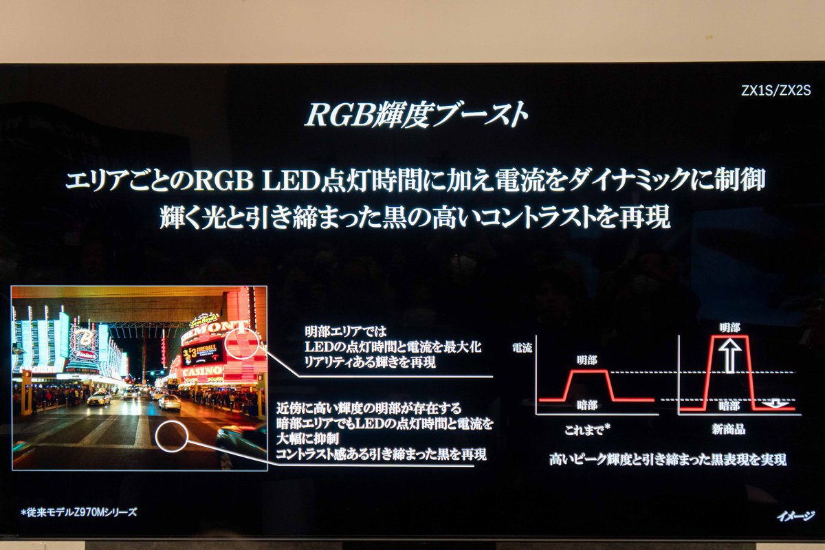 コントラストに関連する部分では、「RGB輝度ブースト」機能を「レグザエンジンZRα」で制御。明部エリアはLEDの点灯時間と電流を最大化してリアリティのある輝きを再現し、暗部エリアは近傍に輝度の高い部分があっても、LEDの点灯時間と電流を大幅に抑制することができるため、引き締まった黒を表現できるとのこと。高いピーク輝度と引き締まった黒表現の両立を成し得ている。