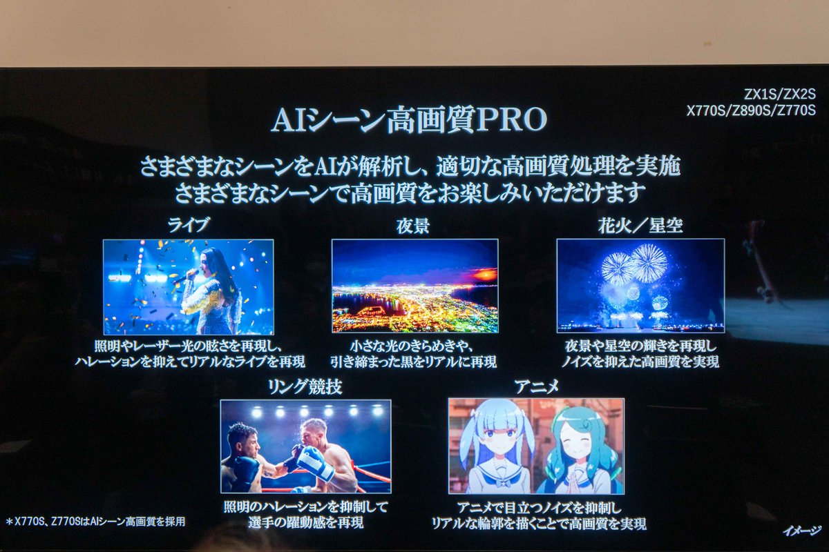 AIによって映像のさまざまなシーンを解析し、適した高画質処理を施すことができる「AIシーン高画質PRO」を採用。音楽ライブでは照明や演出のレーザー光の眩しさを再現しながらもハレーションを低減した映像、夜景シーンでは小さな光のひとつひとつの煌めきや引き締まった黒の再現、花火/星空の映像では、ノイズを抑えながらも光を的確に再現することが可能となっている。