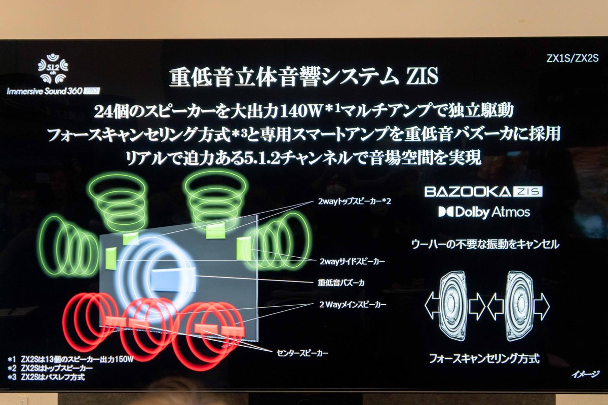 116ZX1Rをリリースした際、「ほかのインチサイズへの展開がほしい」と、オーディオビジュアルファンからの声が多く寄せられたこともあり、ZX1/ZX2シリーズを市場に投入することで、100型から65型までのラインナップ拡充を実現したという。ZX1シリーズとZX2シリーズに投入されている技術については、スピーカー構成などで違いがあると明かした。