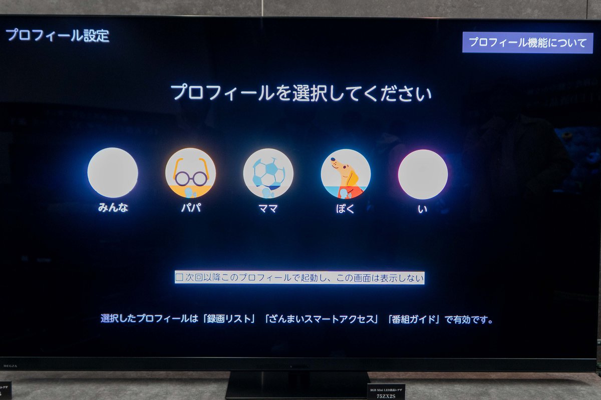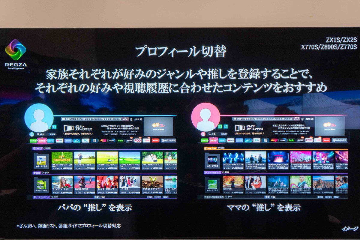 生成AIによるレグザインテリジェンスの機能も進化させている。新たに追加されたのが「プロフィール切替」機能。ざんまいスマートアクセス/録画リスト/番組ガイドの項目で「プロフィール切替」ができるようになっており、家族それぞれが好みのジャンルなどを登録可することで、プロフィール毎に好みや視聴履歴に合わせた映像コンテンツの表示が可能となった。プロフィール登録は4人まで対応する。