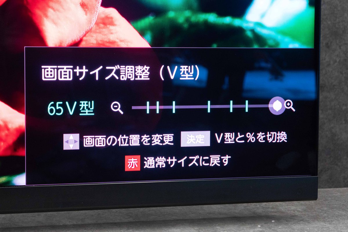 「画面サイズセレクト」では、大画面のテレビでも、好みのサイズで調整することができる。たとえば、85型モデルでも、表示サイズを65型や55型、または43型などに表示サイズをカスタマイズ可能だ。また、画面の高さ、位置も3段階で調整できる仕様になっている。