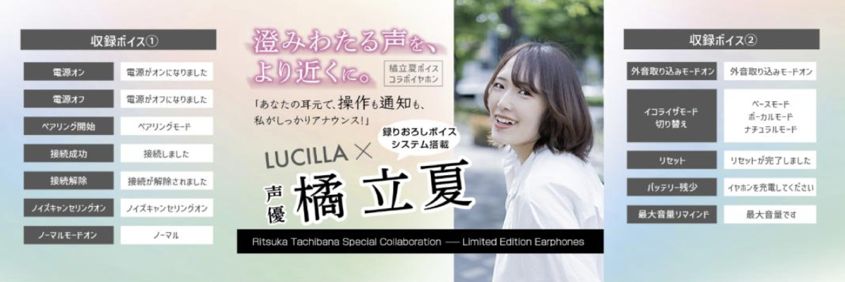 本機は、同ブランドとして初めて “音声体験” に踏み込んだ完全ワイヤレスイヤホン。橘 立夏の澄みわたった声や、イケメンが耳元で囁くような “男性イケボ” のガイダンス音声により、普段のアナウンスとは違った雰囲気で、日常に癒しと潤いを届けるとしている。