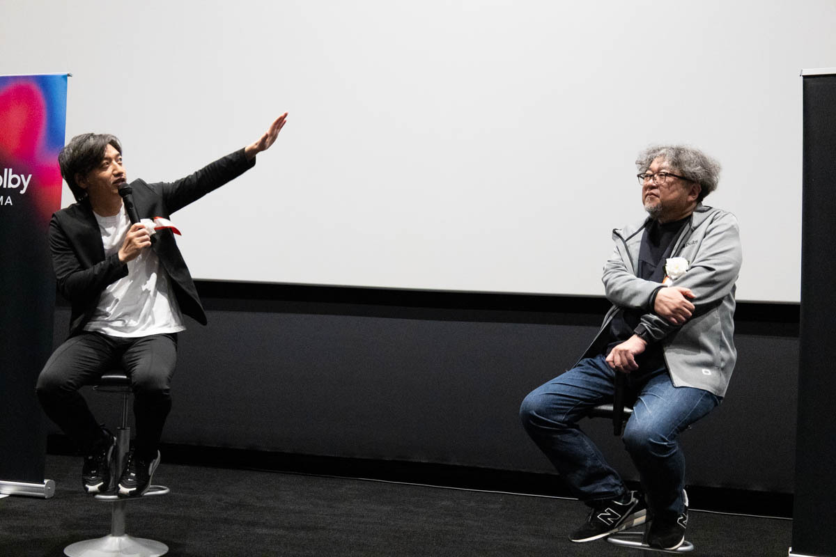 体験会の途中では、映画監督の樋口真嗣さんと音楽家の岩崎太整さんのトークショウを開催。樋口さんはNetflix映画『新幹線大爆破』にてドルビービジョン&ドルビーアトモスを採用するなど、最新技術を活用した映像制作を積極的に手掛けている。ドルビーシネマでの大迫力の視聴体験を踏まえ、「映画館でないと体験できない、思い切りのいいぶっ込み方ができる」と攻めた作品づくりへの意欲を語る。