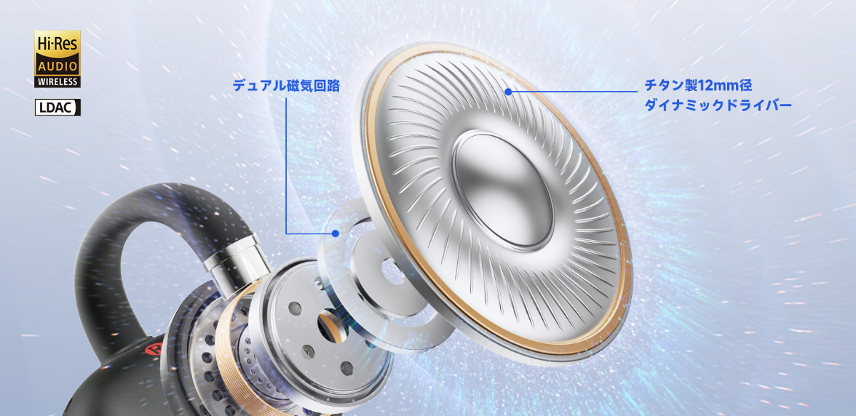音響面の特徴として、12mmチタンコーティング振動板ドライバーを搭載。BassSurge低音増強技術と組み合わせることで、力強い低域と自然なバランスを両立するとしている。加えて、新設計の楕円サウンドポートも採用し、自然で解像度に優れた音場表現と、音漏れの抑制を図ったという。