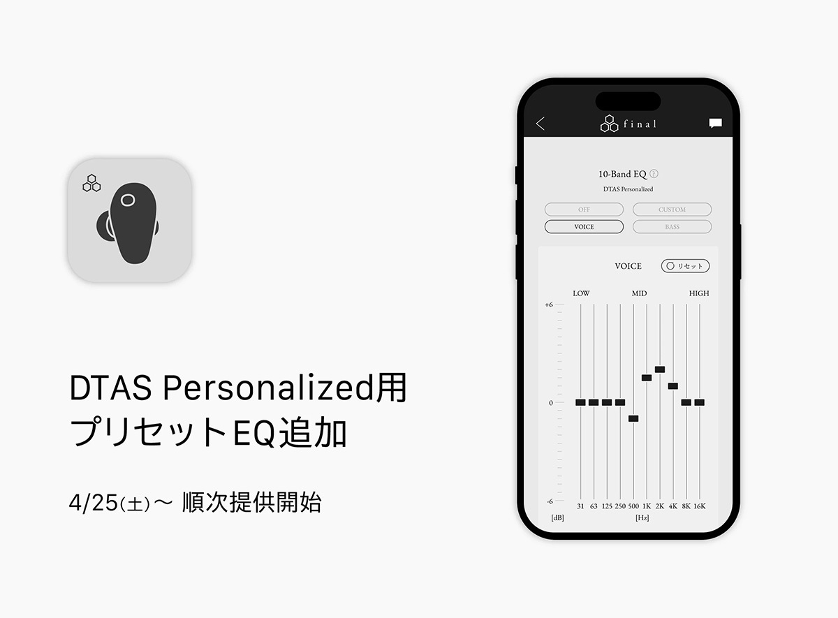 また、DTASによるパーソナライズを実施後に使用できるプリセットEQとして、新たに「VOICE」と「BASS」の2種類を追加。同社によれば、身体形状が異なる他人と “全く同じ音” を聴くことは原理的に不可能だが、DTASによってパーソナライズされた「自然な音色」という共通の土台があれば、EQ設定をそろえることで他人と同じ音を共有できるのだそう。