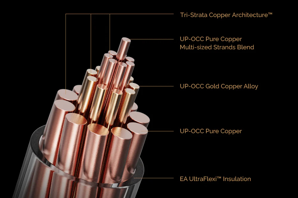 10芯構造と新開発の三層導体設計「Tri-Strata Copper Architecture」を採用。UP-OCC純銅とGold Copper Alloy(金合金銅)を組み合わせることで、力強さ、制御力、解像度を高次元で両立するという。