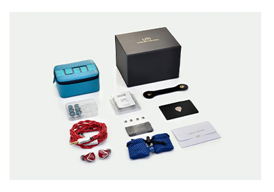 付属のレザーケースはUnique Melodyのブルーを基調にしたブランドカラーを採用。本体には厚さ1.3 - 1.5mmのレザー、中央のフラップ部分には羊革、内装にはネイビーブルーに染色された牛革を使用する。付属品としてほかに、クリーニングクロス、メッシュバッグ×2、ケーブルクリップ、Silicone Ear tips(S/M/L)、AZLA SednaEarfit Xelastec(SS/MS/M)、UM Blue-Core tips(S/M/L)、交換型金属フィルター×4を用意する。