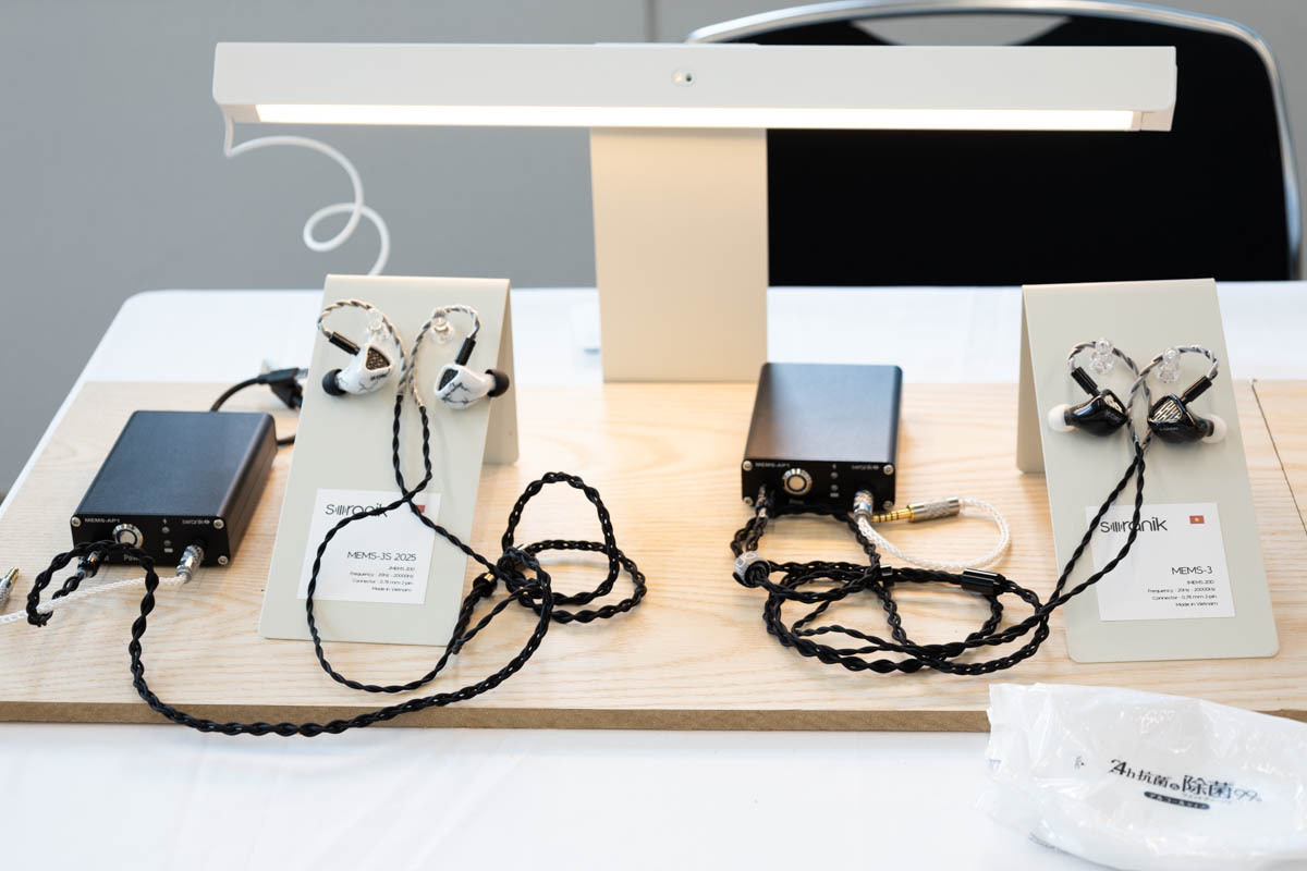 ヘッドホン/イヤホン再生ルーム(5F502)では、高級ブティックのような明るく開放的な雰囲気で、音楽をじっくり楽しめる空間を設営。クラウス・ハインツ氏が立ち上げたArcTech Berlinの「AB92」が体験できる他、SoranikのMEMS技術搭載のイヤホン「MEMS 3S 2025」、専用エナジャイザー(アンプ)を必要とするSoltanus Acousticsなど、主力製品のアピールに力を入れていた。