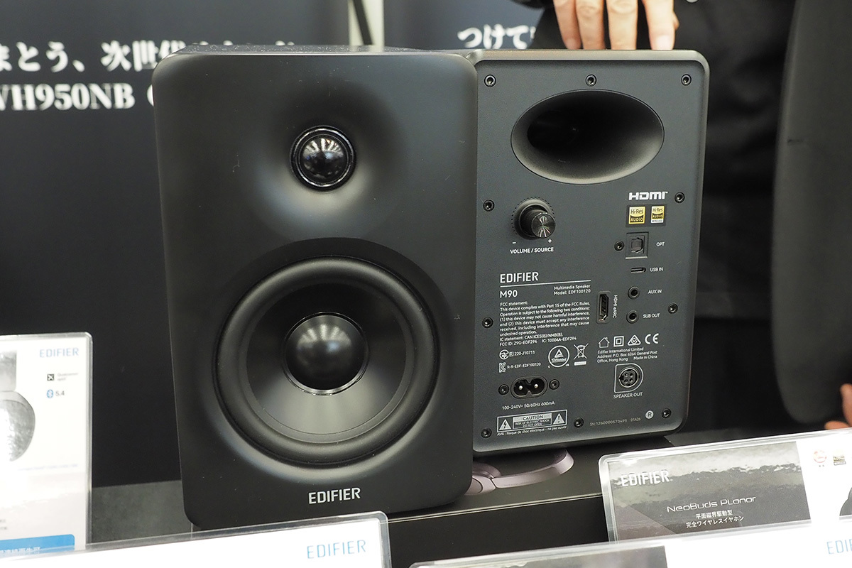 ほか、発売されたばかりのアクティブスピーカー「M90」も。「M60」の後継機として、前モデルからミッドバスドライバーを大型化し、総合出力も100Wまで強化。さらにHDMI端子も新たに搭載する。「デスクトップ用途だった前モデルに対し、テレビのスピーカーなど、幅広い使い方ができるようになりました」と担当者はコメントしていた。