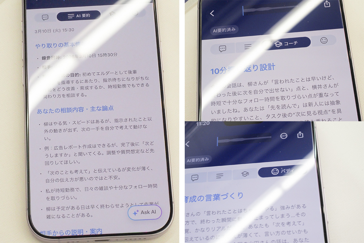 録音デバイスとスマホをBluetooth接続することで録音データを伝送、専用アプリでは単純な文字起こしのほか、論理的なアドバイスを行う「コーチモード」、マインド面のアドバイスを行う「バディモード」など、会話内容をもとに第三者的な視点でアシストを行う。