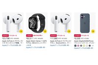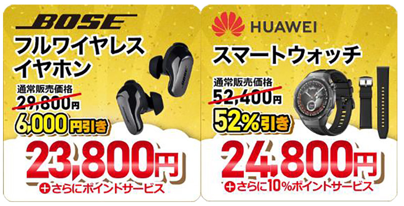 イヤホンでは、BOSEの完全ワイヤレスイヤホンが通常販売価格から6,000円引きの23,800円となる。また、Appleのアクティブノイズキャンセリング搭載「AirPods 4」も5,000円引きの24,800円で登場中。