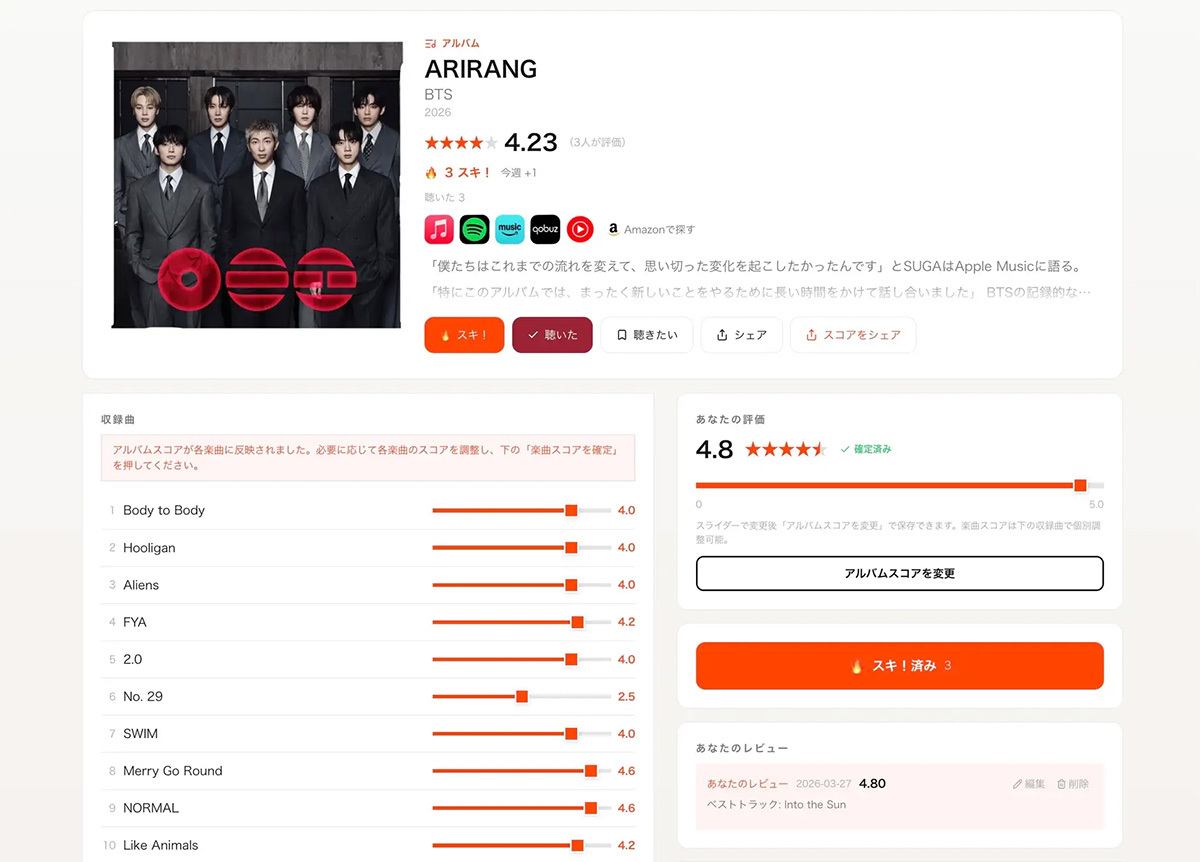 music scoreは「聴いて、記録して、つながる」をテーマに、アルバムや楽曲にスコアをつけたり、レビューを書いたり、ユーザー同士でフォローしあったり、といった機能を備えたウェブサイト。登録無料で利用できます。
