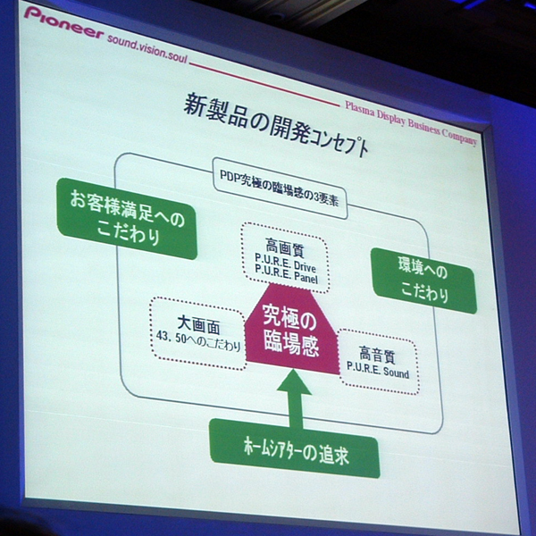 HOME > ニュース > AV&ホームシアターニュース パイオニア、第5世代プラズマ“PUREVISION”の製品説明会を開催 2004年05月25日 前の写真へ 次の写真へ 新製品開発コンセプト 前の写真へ 次の写真へ この写真の記事へ 関連リンク Phile-webニュ-ス[パイオニア、前面ガラスを削除した第5世代プラズマ“PUREVISION”を発売]