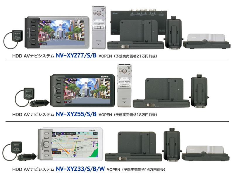 HOME > ニュース > AV&ホームシアターニュース <本日発売>会田肇のソニーHDD AVナビシステム「XYZ(ジィーゼット)」体験レポート〜Part.1〜 2004年06月10日 次の写真へ HDD AVナビシステム「XYZ(ジィーゼット)」シリーズ全機種。上からNV-XYZ77、NV-XYZ55、NV-XYZ33 次の写真へ この写真の記事へ 関連リンク ソニ-「XYZ(ジィ-ゼット)」 オフィシャルサイト Phile-webニュ-ス[3D動画地図情報や映像・音楽が楽しめるカ-AVナビがソニ-より登場]