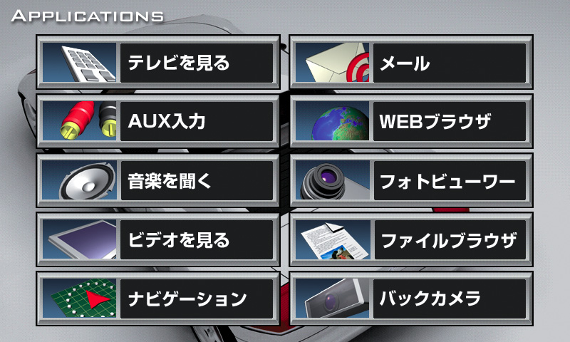 HOME > ニュース > AV&ホームシアターニュース <本日発売>会田肇のソニーHDD AVナビシステム「XYZ(ジィーゼット)」体験レポート〜Part.1〜 2004年06月10日 前の写真へ 次の写真へ 「XYZ(ジィーゼット)」のアプリケーションメニュー画面。タッチパネルによる直感的なカンタン操作を実現 前の写真へ 次の写真へ この写真の記事へ 関連リンク ソニ-「XYZ(ジィ-ゼット)」 オフィシャルサイト Phile-webニュ-ス[3D動画地図情報や映像・音楽が楽しめるカ-AVナビがソニ-より登場]