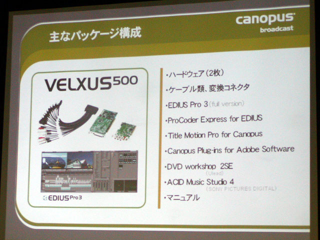 HOME > ニュース > AV&ホームシアターニュース カノープス、HDVに対応したノンリニアビデオ編集システム「VELXUS 500」を発売 2004年09月29日 前の写真へ 次の写真へ VELXUS 500のパッケージ構成 前の写真へ 次の写真へ この写真の記事へ 関連リンク 本機のニュ-スリリ-ス