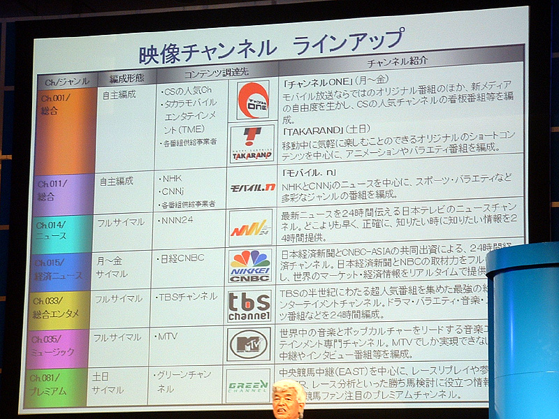 HOME > ニュース > AV&ホームシアターニュース ついに始まるモバイル放送「モバHO!」。開局時は約40チャンネルを用意 2004年10月04日 前の写真へ 次の写真へ 映像チャンネル全7ch 前の写真へ 次の写真へ この写真の記事へ 関連リンク モバHO! モバイル放送株式会社