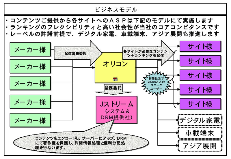 HOME > ニュース > AV&ホームシアターニュース オリコンが音楽配信に参入、日本最多のレーベル数と楽曲数を実現 2004年10月06日 オリコンDDのビジネスモデル この写真の記事へ 関連リンク オリコン(株)