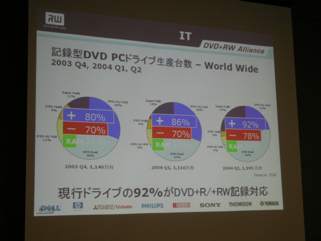 HOME > ニュース > AV&ホームシアターニュース DVD+RWアライアンス、高速記録&DLメディアの新たな技術展開を発表 2004年10月21日 前の写真へ 次の写真へ 「記録型DVDドライブの傾向」 前の写真へ 次の写真へ この写真の記事へ 関連リンク DVD+RWアライアンスの詳細について