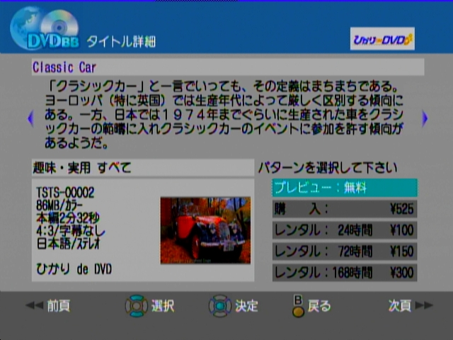 HOME > ニュース > AV&ホームシアターニュース 世界初、FTTHとDVDレコーダーを組み合わせた映像配信サービスの試験運用がスタート 2004年11月02日 前の写真へ 次の写真へ サービスタイトルの詳細画面 前の写真へ 次の写真へ この写真の記事へ 関連リンク 「ひかり de DVD」サ-ビスの詳細はこちら モニタ-登録はこちら