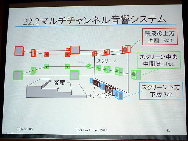 HOME > ニュース > AV&ホームシアターニュース 今日は「音の日」 JASコンファレンス2004開催〜サラウンド最前線 2004年12月06日 前の写真へ 次の写真へ 22.2chサラウンドの説明図 前の写真へ 次の写真へ この写真の記事へ 関連リンク 日本オ-ディオ協会