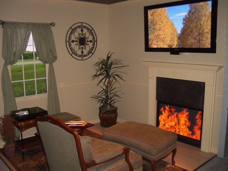 暖炉も窓から見える風景も実はプラズマテレビの映像だ。写真では本物と見紛うリアルさがある。