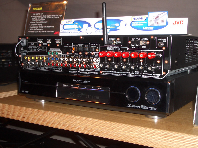 ワイヤレスでUSBオーディオを再生するPCリンク機能を積んだAVアンプRVXD702B(上)。
