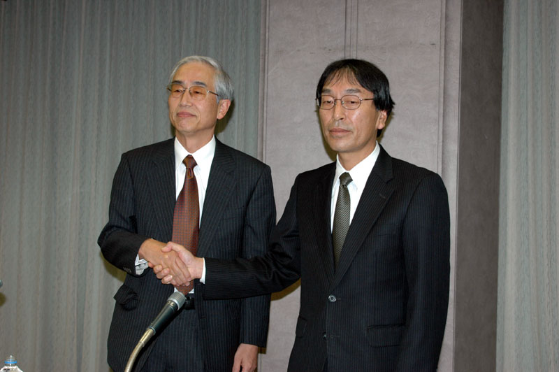 握手を交わす草間氏(左)と花岡氏(右)