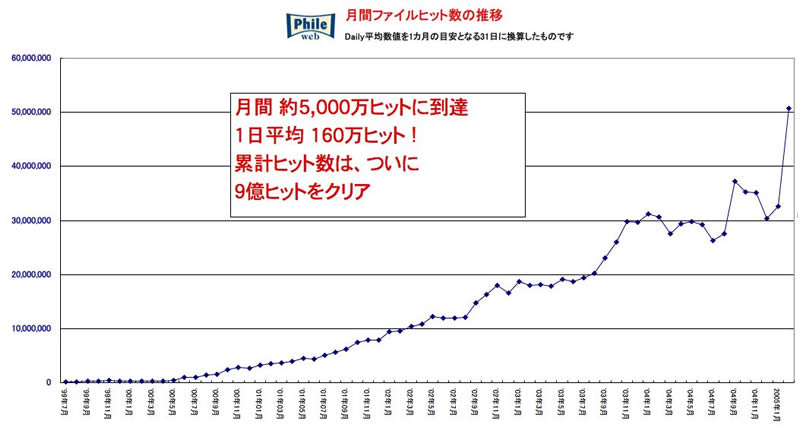 HOME > ニュース > AV&ホームシアターニュース [特報] Phile-webの2月度アクセス数、ついに5,000万ファイルヒットを達成! 2005年03月01日 ヒット数の伸びを示したグラフ この写真の記事へ