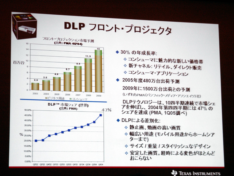 HOME > ニュース > AV&ホームシアターニュース 日本TI、低コスト新型DLPチップを発表。1080pモデルも本年中に登場 2005年03月01日 前の写真へ 次の写真へ フロントプロジェクターの説明 前の写真へ 次の写真へ この写真の記事へ 関連リンク 「DLP.55」のニュ-スリリ-ス