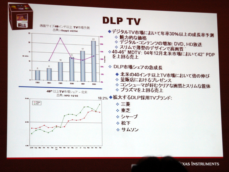 HOME > ニュース > AV&ホームシアターニュース 日本TI、低コスト新型DLPチップを発表。1080pモデルも本年中に登場 2005年03月01日 前の写真へ 次の写真へ リアプロジェクションテレビの説明 前の写真へ 次の写真へ この写真の記事へ 関連リンク 「DLP.55」のニュ-スリリ-ス