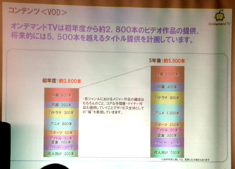 HOME > ニュース > AV&ホームシアターニュース フレッツユーザー向けVODサービス「オンデマンドTV」が3月9日スタート 2005年03月07日 前の写真へ 次の写真へ VOD配信するコンテンツの内訳 前の写真へ 次の写真へ この写真の記事へ 関連リンク オンデマンドTV