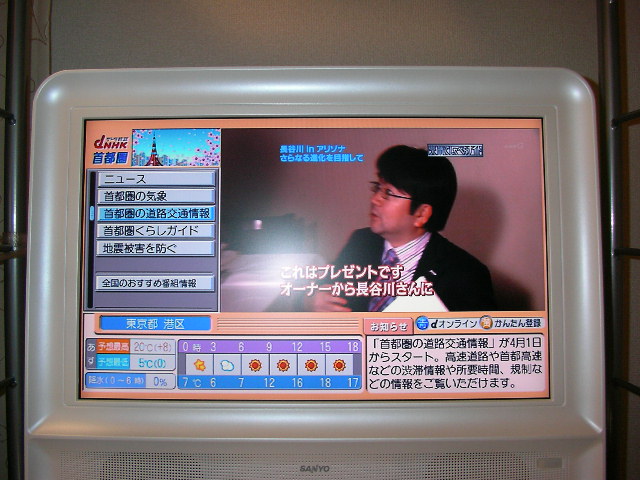 HOME > ニュース > AV&ホームシアターニュース データ放送に道路交通情報が登場。渋滞予測情報は6日から開始 2005年04月05日 次の写真へ NHKのデータ放送のトップページ 次の写真へ この写真の記事へ