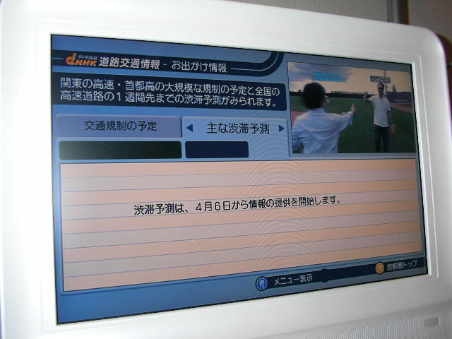 HOME > ニュース > AV&ホームシアターニュース データ放送に道路交通情報が登場。渋滞予測情報は6日から開始 2005年04月05日 前の写真へ 次の写真へ お出かけ情報に進むと主な交通規制の予定、渋滞予測を見ることができる 前の写真へ 次の写真へ この写真の記事へ