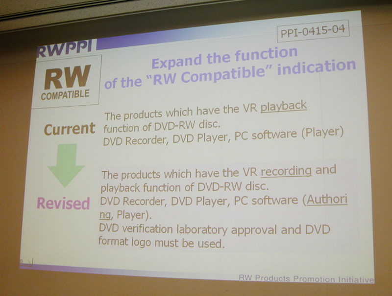 HOME > ニュース > AV&ホームシアターニュース 会員メンバーも70社に拡大、RWPPIの第30回定例会議が開催される 2005年04月18日 前の写真へ 次の写真へ 「RWコンパチブル」表示の仕様規約変更もこの日の議題となった 前の写真へ 次の写真へ この写真の記事へ 関連リンク RWPPIのホ-ムペ-ジ