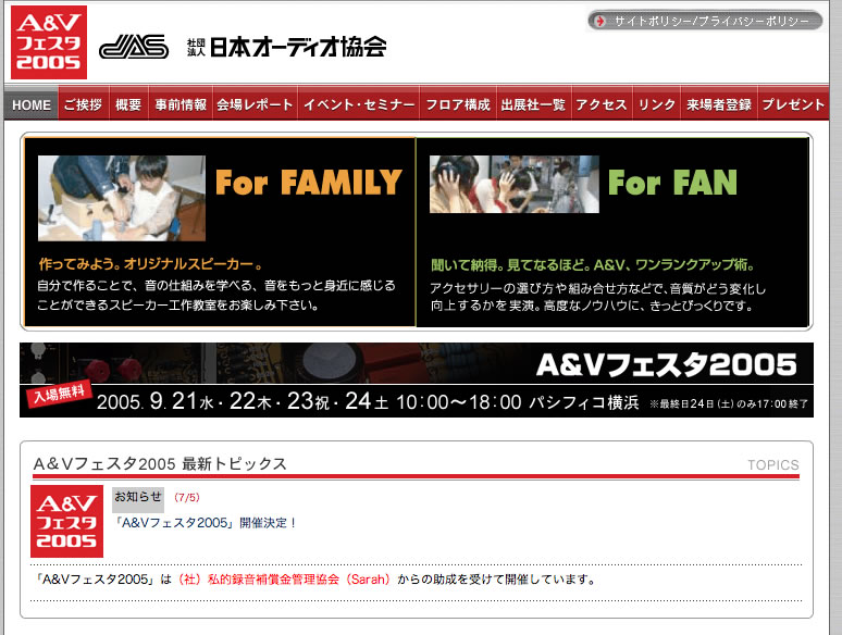 HOME > ニュース > AV&ホームシアターニュース 「A&Vフェスタ2005」今年も開催決定! 記者会見で詳細が明らかに 2005年07月05日 前の写真へ 公式サイトのトップページ 前の写真へ この写真の記事へ 関連リンク 「A&Vフェスタ2005」公式サイトはこちら 昨年行われた「A&Vフェスタ2004」のPhile-web特設ペ-ジ