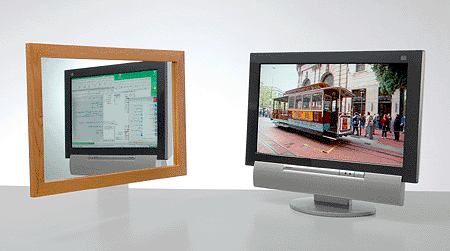26型液晶IT-TV試作機。右方向にはテレビ動画を、左方向にはインターネット画面を同時表示(鏡に反射)している