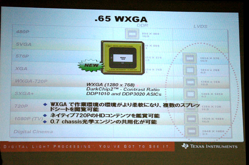 HOME > ニュース > AV&ホームシアターニュース 日本TI、6色カラーフィルター採用のDLP向け新技術を発表 2005年07月26日 前の写真へ 新チップ「DLP .65」 前の写真へ この写真の記事へ 関連リンク 「BrilliantColorテクノロジ-」のニュ-スリリ-ス 「DLP .65」のニュ-スリリ-ス