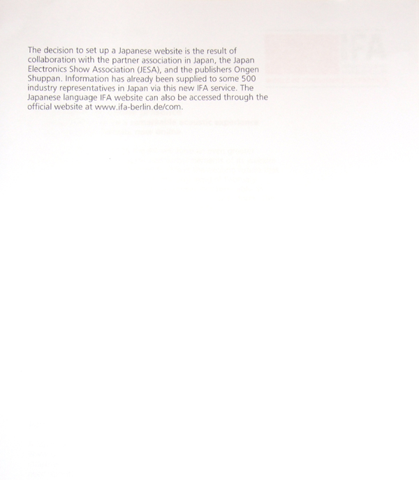 HOME > ニュース > AV&ホームシアターニュース <IFA2005レポート:IFA 報道発表> 日本語によるIFAウェブサイトを運用 2005年09月04日 前の写真へ IFAリリース 前の写真へ この写真の記事へ 関連リンク IFA2005 公認 日本語サイト IFA2005レポ-ト一覧
