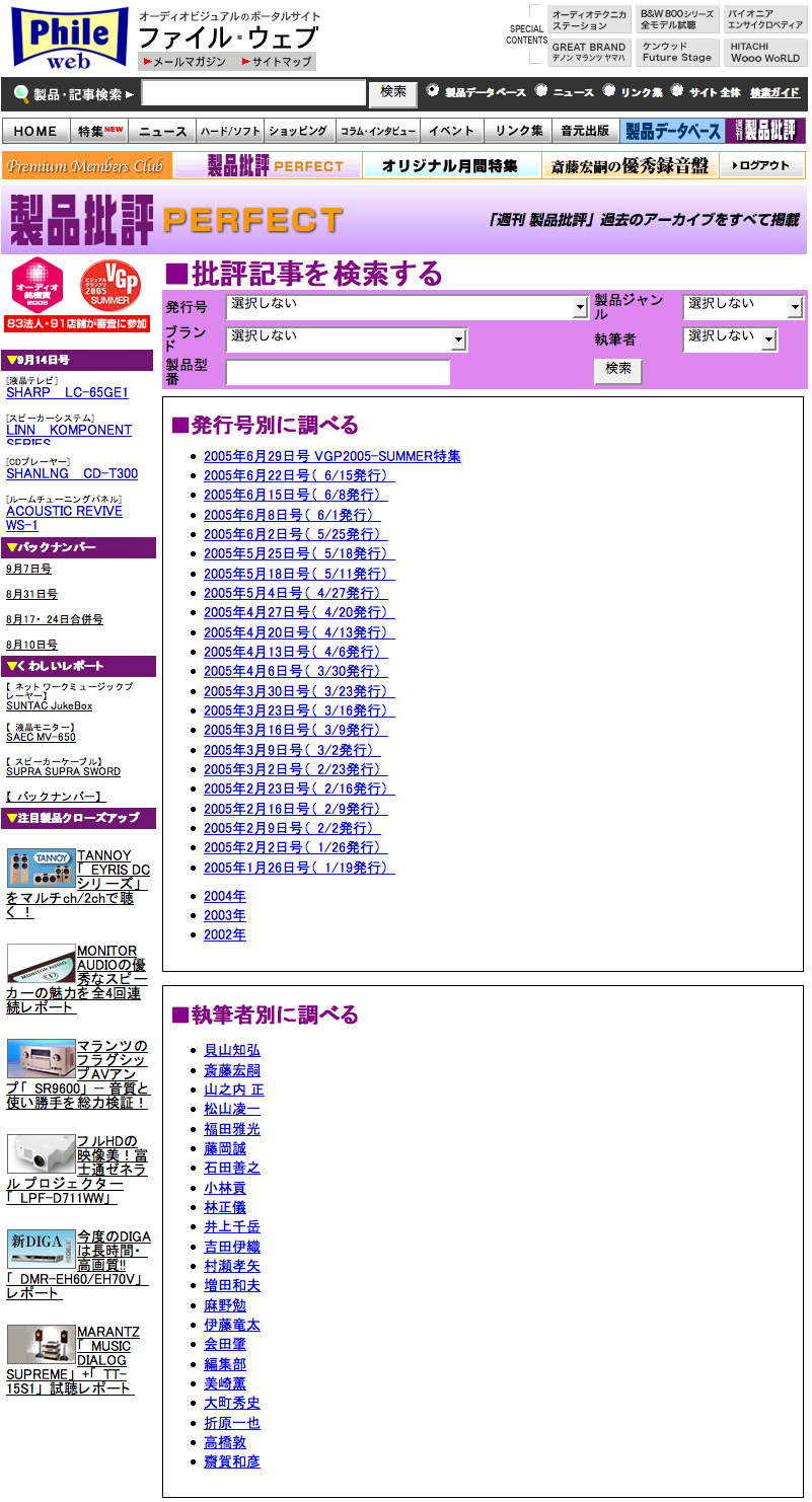 HOME > ニュース > AV&ホームシアターニュース Phile-webに超豪華コンテンツを用意したプレミアムサービスが登場! 10月3日から受付 2005年09月29日 次の写真へ 「製品批評PERFECT」のトップページ。1,600を超える製品批評のバックナンバーを自在に検索・閲覧できます 次の写真へ この写真の記事へ 関連リンク Phile-web プレミアムメンバ-ズクラブ
